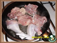 На сковороде в сливочном и оливковом масле [i] (масло брала слив.+ растит. по 1 ложке)[/i] обжаривать курицу, разделанную на куски, со всех сторон примерно 10 минут. |