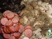 Переложить мясо к квашеной капусте. Добавить туда же нарезанную копченую колбасу или грудинку и чернослив. Приправить специями и солью по вкусу. |