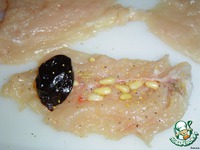 Чернослив (без косточки) начиняем кедровыми орешками, укладываем его на край филе (я еще и на филе добавила орешки), сворачиваем рулетиками. Скалываем зубочистками. |