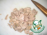 Мясо, достаем из бульона и, отделив от костей, мелко рубим. |