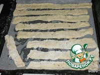 Раскатать тесто толщиной примерно 1 см или чуть меньше и длинным острым ножом нарезать на тонкие полоски примерно по 0,5 см. |