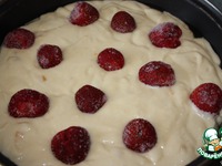 В смазанную форму кладем половину подготовленной клубники, заливаем тестом и сверху опять выкладываем наши ягодки. |