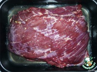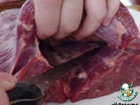 Мясо острым ножом отчистить от пленок и лишнего жира, в соединительной ткани между двумя слоями мяса прорезать карман для начинки и натереть солью и перцем |