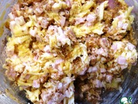 Уже в другую посуду подавить чеснок, +нарезать сало кубиками, +натереть сыр, +добавить яйца, муку, сухари +отжатые булочки |