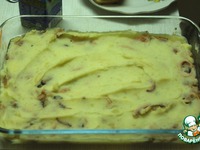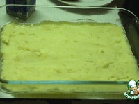 Из предварительно сваренной картошки делаем пюре (добавляем молоко и сливочное масло). Противень смазываем растительным маслом, затем выкладываем половину пюре. Это будет первый слой. |