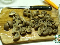 Предварительно сваренные грибы режем пополам. |