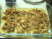 Морепродукты накрываем вторым слоем - оставшейся картошкой. |