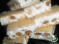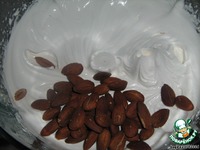 Итак, смешиваем в кастрюльке воду, сахар, глюкозу, мед (можно и засахаренный, растапливать не обязательно - я такой и брала) и ставим на сильный огонь. Как только смесь закипит, варим ее до 145 градусов (при наличии термометра). Если вы такие же "счастливицы" как и я - т. е. без подобной роскоши, тогда варим сироп не более 11 минут, и не менее 10 минут на сильном огне. Это очень важный момент, потому что если сироп не доварится, то нуга не застынет. Варка сиропа - самая главная часть приготовления нуги. Нужно уловить момент, когда сироп густеет, но еще не стал карамелью - это при отсутствии градусника для сахара. Плиты у всех разные, поэтому время дается относительное, но на него нужно ориентироваться. У меня на плите самая мощная отметка - это цифра 3. Сироп я варила 11 минут, но, честно говоря, добавила бы еще минутку.