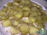 2. Огурец нарезать кольцами и уложить на курицу, промазать майонезом. |