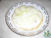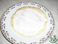 Выкладываем блин на тарелку, смазываем мягким творогом (у меня была творожная "Aктивиа"), можно заменить творожной массой. |