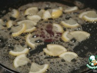 В другой сковороде растопить 10 г масла (я добавила 1 ч.л. сахара) и обжарить кусочки лимона с каждой стороны 2-3 минуты. |