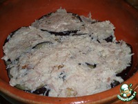 В глиняную кастрюльку или горшочек выложить баклажаны и сверху, на каждый кусочек, приготовленную ранее смесь, снова баклажаны и сверху смесь. Затем поставить в духовку на 180° до тех пор... |