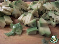 Тем временем очистим авокадо, удалим косточку и порежем мелко мякоть. Перемешаем его с небольшим количеством оливкового масла (я брала с ароматом чеснока), посолим и поперчим. |