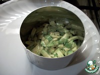 Металический цилиндр установим на блюде, на дно разложим авокадо, слегка прижмем. |