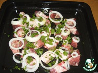 Выкладываем кусочки мяса на противень, сверху лук кольцами и зелень. Солим, перчим, добавляем приправы по вкусу. |