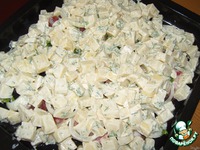 Картофель режем кубиками и смешиваем с майонезом и зеленью. Солим, перчим, добавляем приправы по вкусу. Выкладываем на мясо. Запекаем в духовке минут 40 при 180-200С. |
