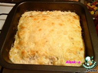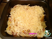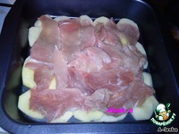 Мясо режем тонкими пластинками (примерно полсантиметра в ширину) и выкладываем поверх картофеля. |
