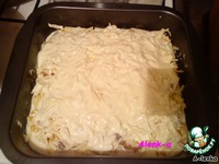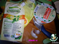 Готовим заливку: майонез, сметана, выдавленный чеснок, потом я добавила немного молока (потому что получилось очень густая заливка и было неудобно ею поливать). |