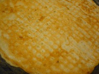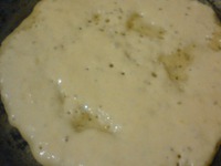 Той же поварешкой размазываем тесто по всей плоскости дна сковородки, делая круговые движения. |