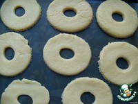 Раскатать охлажденное тесто на столе, вырезать колечки, выложить на противень, покрытый бумагой(силиконовый коврик), и выпекать в горячей духовке при 200 гр. 10 мин. |