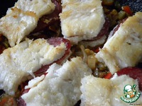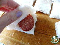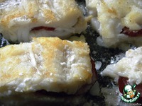 Филе трески вымыть, обсушить, нарезать кусками и надрезать каждый, не прорезая насквозь. Вложить ломтики салями. |
