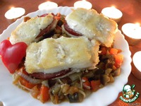 Солим, перчим, укладываем на овощи рыбу и готовим ещё 10 минут. |