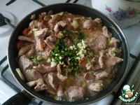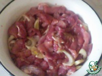 Для начала нарежем мясо брусочками и замаринуем с луком и соевым соусом. Поперчим, добавим хмели-сунели и оставим мариноваться на 30 мин. |