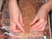 Взбиваем желток, тщательно закрепляем шов рулета, смазываем желтком. |