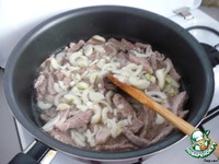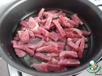 Мясо нарезать полосками, обжарить в растительном масле. |