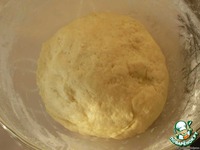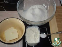 Муку просеять вместе с разрыхлителем, добавить сметану, растопленный маргарин, замесить. Скатать в шар и убрать в холодильник. |