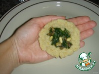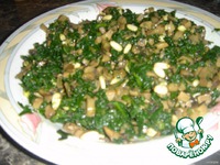 К луку добавить грибы, обжарить. Смешать грибы со спинишем и орехами. |
