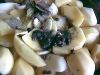 Укладываем картофель к остальным овощам и мясу. Сверху закладываем специи и заливаем маслом и уксусом. |