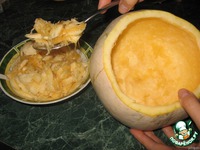 Всё сложить в тыкву, закрыть крышкой. Поставить в прогретую духовку. Готовить при t200* 30-40 мин., в зависимости от размера тыквы |