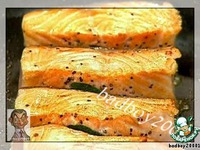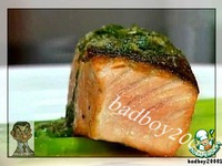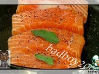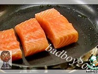 На сковородку наливаем немного оливкового масла и кладем шкуркой вниз кусочки лосося, немного прижимаем рукой, чтобы вся поверхность прихватывалась равномерно. |