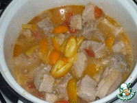 Переложим все в кастрюлю, добавим кумкваты. Поставим все тушиться на медленый огонь. |