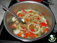 Для начала режем лук крупными колечками, половину перца красного сладкого нарезаем тоже колечками, другую половину - соломкой или квадратиками. |