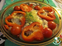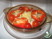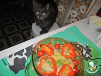 Затем снимаем с плиты, сверху посыпаем тертым сыром и укладываем наверх рыбки нарезанный колечками красный перец и половинки помидорок Черри. Ставим в микроволновку на 2-3 минуты. |
