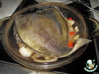 Перекладываем овощи на сковородку, сверху укладываем рыбку, слегка перчим и посыпаем базиликом. Готовим под крышкой на среднем огне 7-10 минут, перевернув камбалу один раз. |