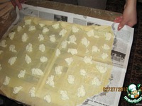 Берем наше раскатанное тесто, кладем его на лист газеты и смазываем топленым сливочным маслом. |