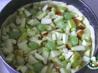 Делаем начинку: режем яблоки кубиками, смешиваем с 3 ст.л. лимонного сока. Выкладываем ее на пирог (я добавила немного виноградинок). Ставим в предварительно разогретую духовку и выпекаем. |