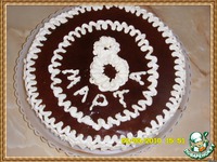 Сверху сделала глазурь. Сливки (150 гр) довести до кипения + 1 плитка темного шоколада на мелкие кусочки, хорошенько перемешать. Дать немного остыть массе, затем полить пирог. |