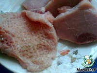Мясо нарезать порционно, отбить, посолить и поперчить. |