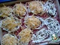 Полить майонезом и посыпать сыром. |