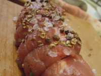 - в ступке смешаем смесь перцев, кориандр в зернах и крупную морскую соль. Крупно потолчем. |