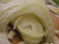 - а пока суть да дело, режем фенхель - в форму для запекания кладем чеснок (я разрезаю пополам), фенхель, чуть присолим и приперчим |