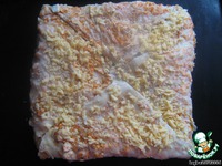Затем выкладываем слой сыра. Поступаем так со всеми раскатанными пластами. Лучше сделать два пирога по 7 слоев, потому что пирог может не пропечься. |