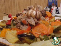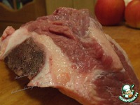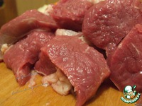 Нарезаем мясо на крупный кубик и укладываем на сало. Сначала идут куски на кости, затем филе. |