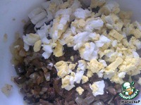 Лук с грибами охладить, добавить рубленое яйцо, соль, перец. Хорошо перемешать. |