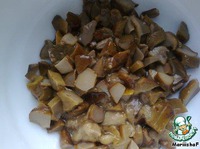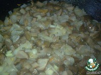 Грибы, если свежие, отварить, я использовала грибы домашней заготовки, мелко нарезать. |