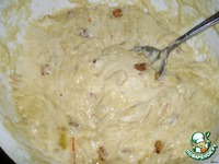 Смешать тёплый сок, масло, цукаты, промытый изюм, мёд, сахар, ваниль. Всыпать муку. Соду погасить уксусом. Перемешать. Получается немного тягучее тесто. |